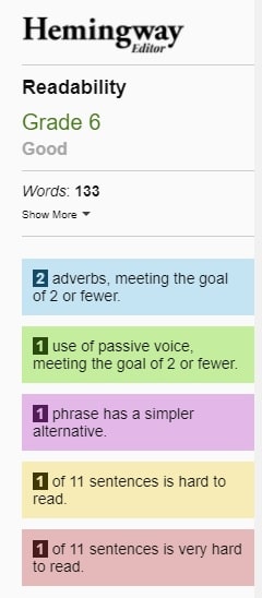 Hemingway also assigns a grade level for texts. Thus, writers and editors can assess the reading difficulty of their materials. This feature enables writers and editors to simplify or increase the complexity of their texts to meet their target grade-level reading.