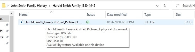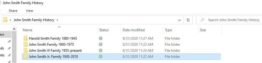 In the screenshots below, you will see an example of my preferred method of organization. For each branch of the family I am researching, I have a master folder with sub-folders for each generation.