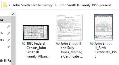 Once you’ve decided on a filing system, you will need to come up with a file naming system to identify each document you are saving in the folders. For digital files, this could be something as simple as a person’s name, the document type, and the date (John Smith III_BirthCertificate_1955).