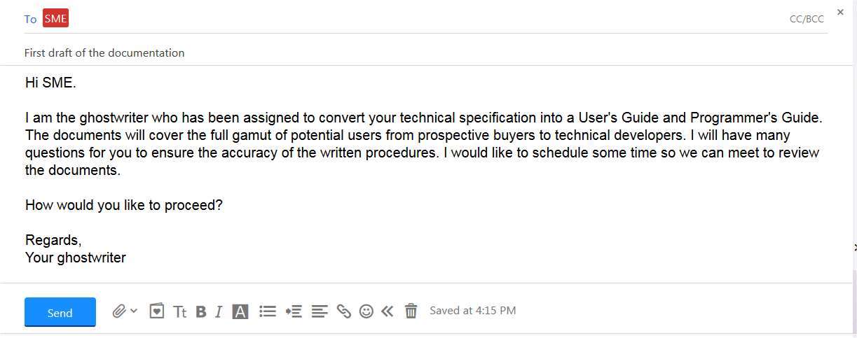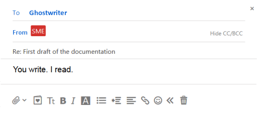 - It’s all about the SME. Rather than trying to push all SMEs into providing large amounts of information upfront, a considerate writer will take each SME’s personal circumstances into consideration. For example, years ago I wrote a detailed, somewhat verbose message to introduce myself to a far-flung SME whom I had never met.
