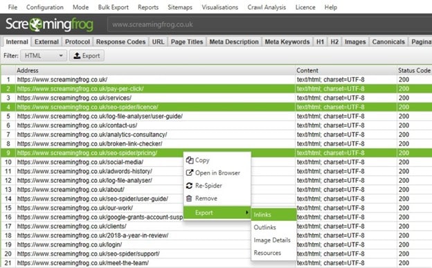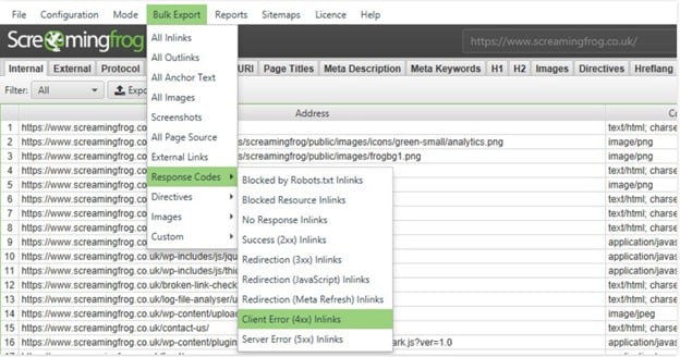 As shown in these pictures from Screaming Frog’s site, you’ll get a list of your URLs accompanied by certain criteria, like what kind of site it is (text, image, or something else).