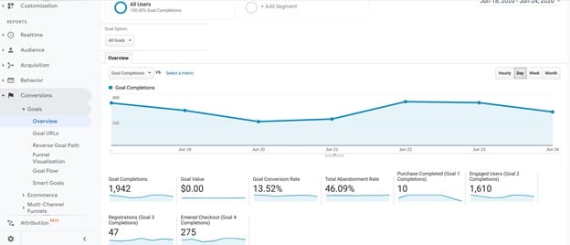 To track your goal, you simply choose the “Conversions” option on the left side and open Goals > Overview. You will see how many goal completions were achieved (like how many products were sold), conversion rate, and abandonment rate, to name a few.