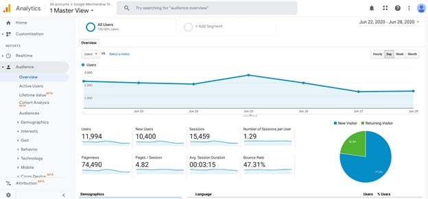 On the “Audience” tab, you can view other metrics of user engagement, including bounce rate and average session duration. You can even see the most popular places your views come from, displayed in a pretty pie chart to compare social media to organic searches to direct searches. Or, like the view pictured below, you can see graphs demonstrating percentage of new users vs. returning users.
