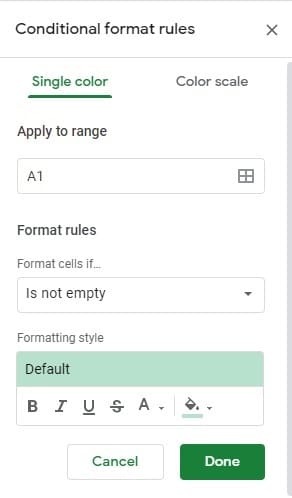 To set conditional format, select Format > Conditional Formatting from the top menu. It will look like this picture from Google Sheets.