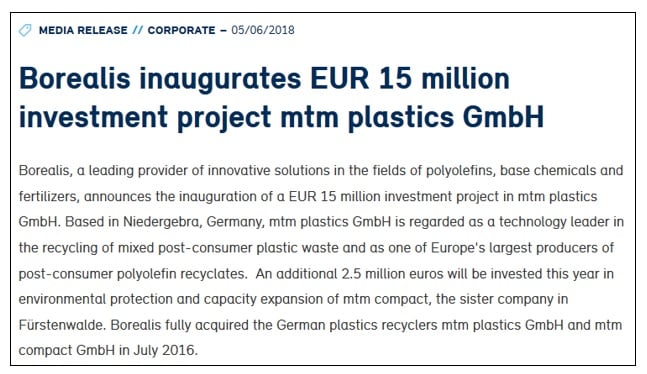 Likewise, with a few modifications to the original text, it could have offered a clear and succinct explanation of its investment program. More specifically, it could have used the following as its second paragraph: “The company is set to spend EUR 15 million on the expansion of a plastics recycling facility that it acquired through the acquisition of another German firm, mtm plastics GmbH, in 2016. The project aims to boost the capacity of the plant, which is located in Niedergebra, Germany, while also improving its ability to navigate the high-end market of plastic re-granulates.”