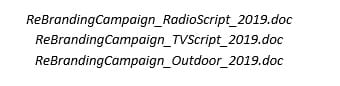 For example, let’s say the ad agency created a comprehensive branding campaign for client ABC. The campaign encompasses radio, television, and outdoor advertising. They might consider using names like these and placing all of the documents into a folder labeled ClientABC:
