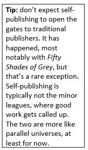 You want to be sure of publication. With self-publishing, you have a publisher who adores your book. So you can write with the confidence that others will see it. It won’t lie unread in the hard drive, perhaps to vanish in a crash.