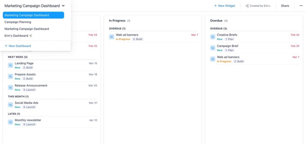 Dashboards in Wrike are customized platforms that show your work progress through the entire content campaign. They provide real-time workflow data so you can stay current on all project activities. You can also maximize efficiency and productivity by generating real-time reports.