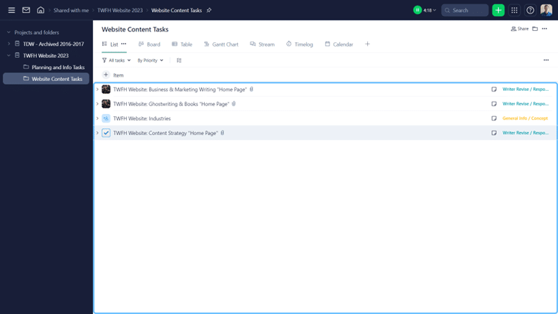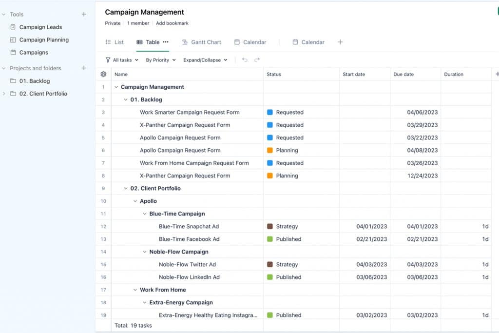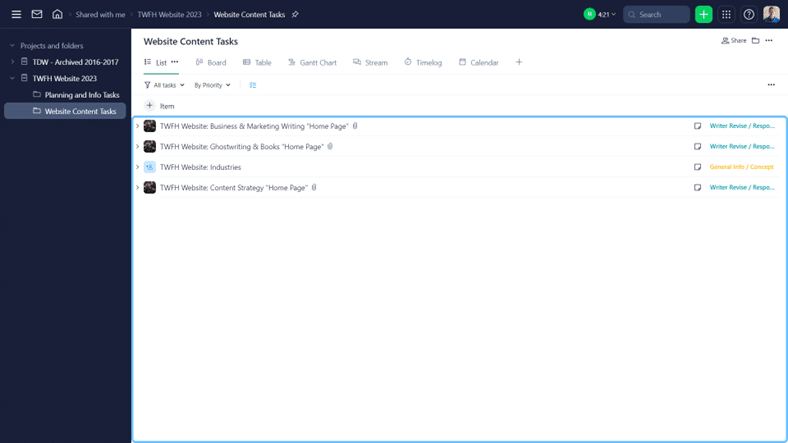 For example, leverage Wrike’s unique permalink feature to crosslink work items. Also, switch to table view often to get a broader picture of all your projects.