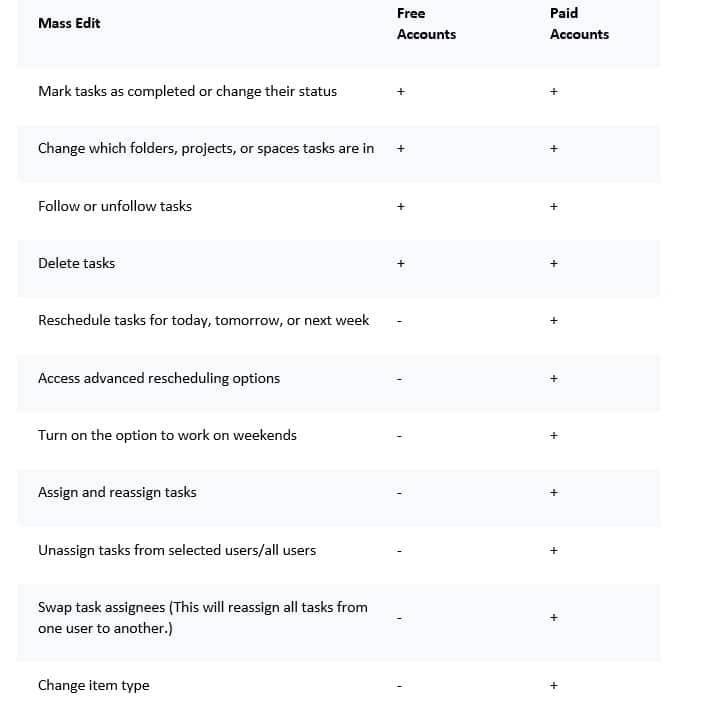 The following chart shows the mass editing features available in Write’s free and paid accounts.