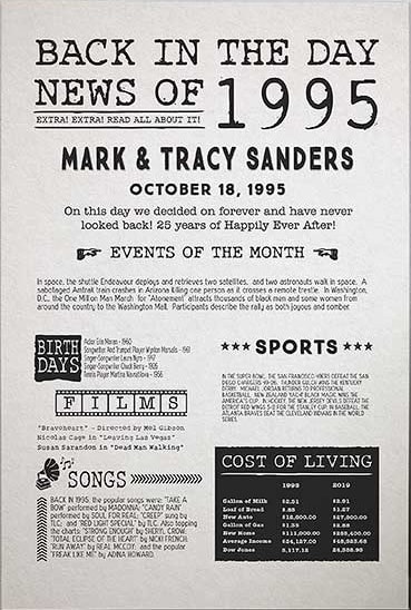 The print will include whatever personal information you want as well as fun facts and significant events from that day in history.