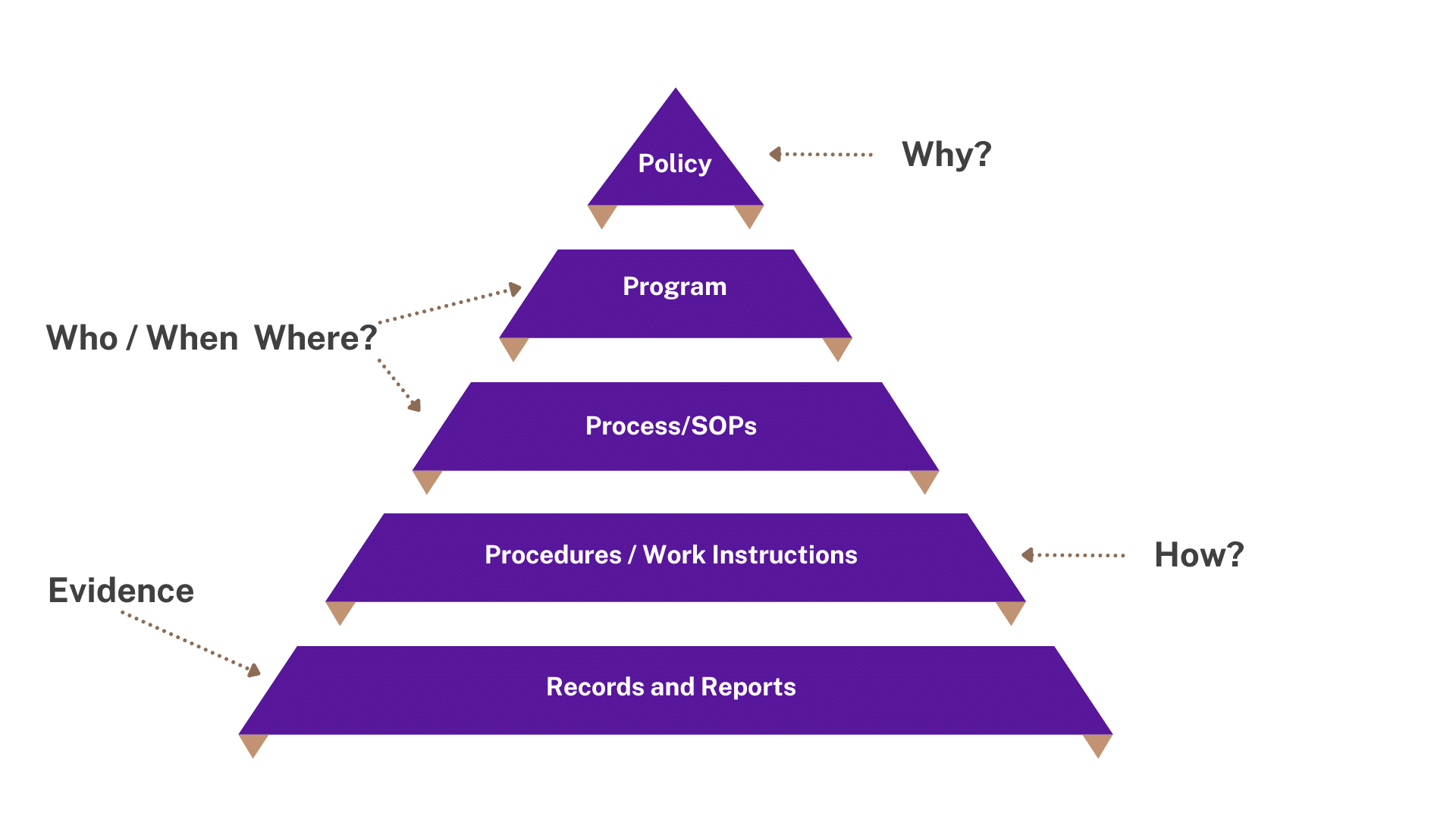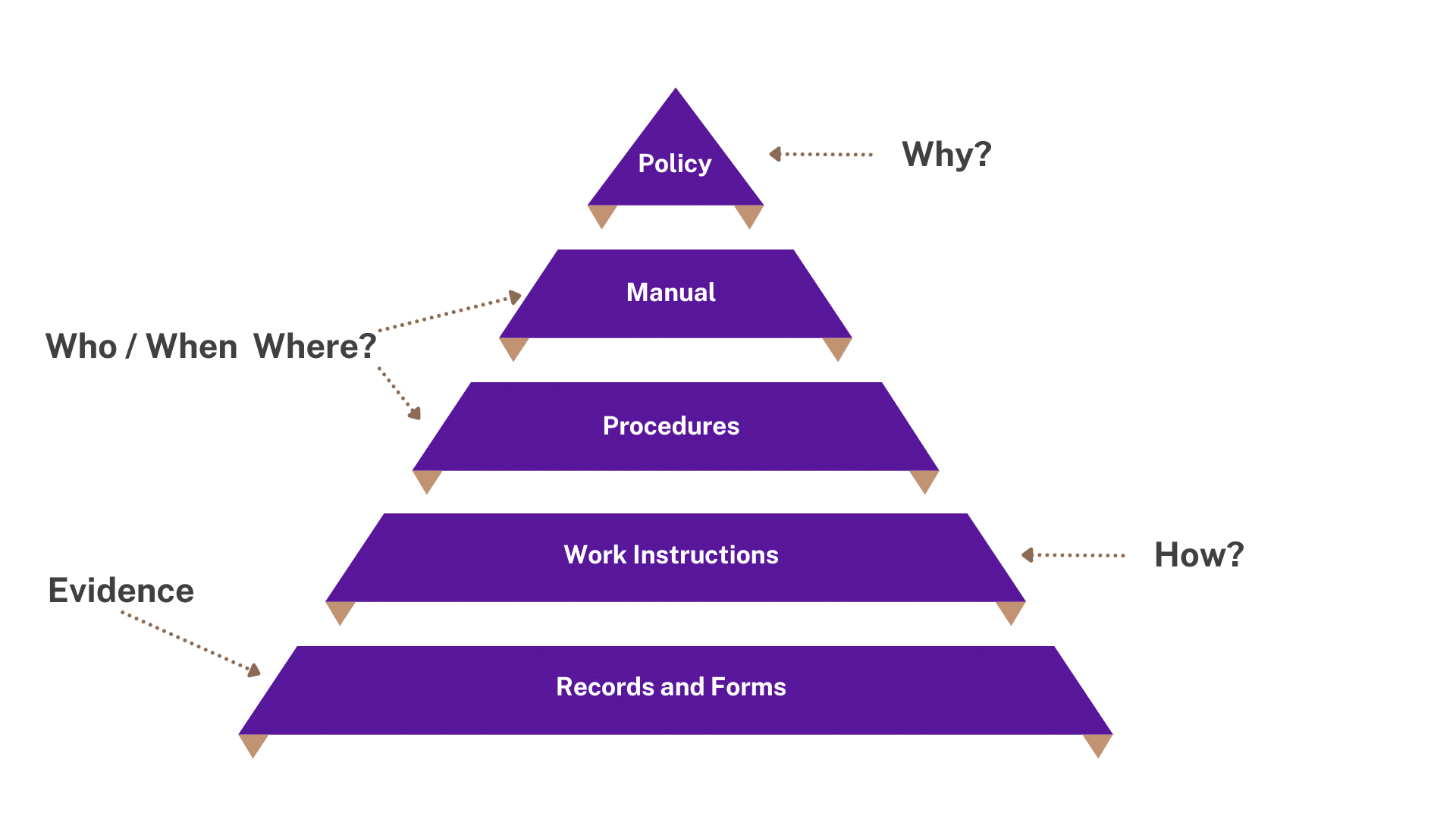 We’ll help you define your documentation hierarchy. This involves separating the documents into tiers from the most general to the most specific. For example, a common document hierarchy includes: