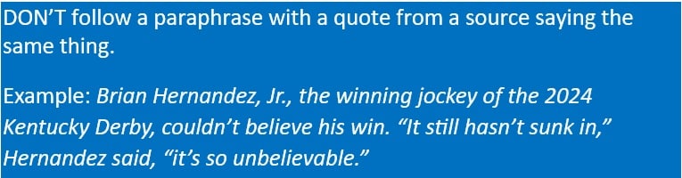 Finally, don’t repeat yourself. The meaning in any paraphrase you write should not be “echoed” in a quote. Remember, if it’s easier and more expedient to paraphrase, then do that as a writer.
