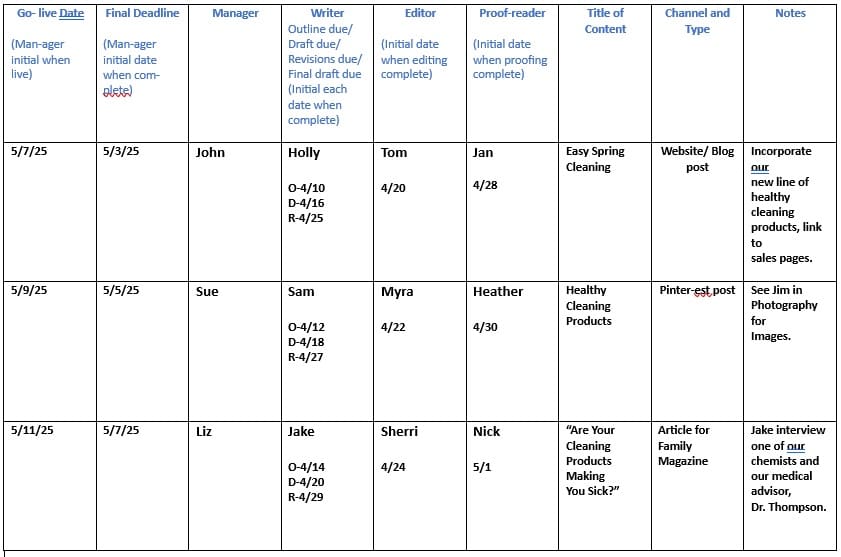 1) The rationale for having a schedule in place. Upsides to point out include: Everyone will know what is required of them and can better manage their time; staff can better coordinate their efforts; content is improved by advance planning; everyone can see the “big picture” of your marketing strategy; and any other reason that applies to your company’s methods and culture.