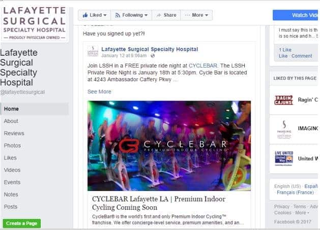 As shown above, Hebert recently used the LSSH Facebook page to promote a community event she organized in conjunction with a new fitness facility. Anyone who saw the page was invited to a free class at a new indoor cycling facility near the hospital.