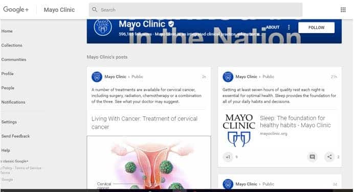Lee Aase is the director of Mayo’s Social and Digital Innovation Team, which is staffed by eight media professionals who orchestrate the system’s posts on Facebook, Twitter, Google+, Pinterest, and You Tube. Activity on each outlet is unique, as shown below in the Facebook, Twitter, and Google+ feeds one afternoon in mid-January 2017.