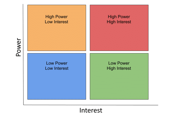 The higher their interest and power, the more effort you should be dedicating to engage with them. The lower their interest and power, the less effort you need to put in to engage with them. This sorting of power to interest can be visualized using the Power-Interest Matrix below: