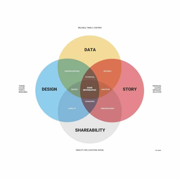 As the image below by infogram.com illustrates, there are broadly four areas you should pay close attention to: data, design, story, and shareability.