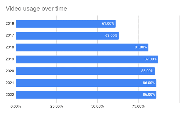 Today, video marketing still remains the backbone of terrestrial TV and has infiltrated all corners of the internet. In fact, more than half of Twitter’s ad revenue is generated through video ads. Marketers in all industries love video, as it is undoubtedly the king of all kings, with around 86% of all businesses using it, according to Wyzowl.com. As the graph by Wyzowl’s State of Video Marketing Survey illustrates, the use of video as a marketing intervention by all businesses has increased by 25% since 2016.