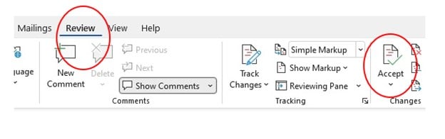 2. Now, go to the “Review” tab on your toolbar, and click on the “Accept” button.