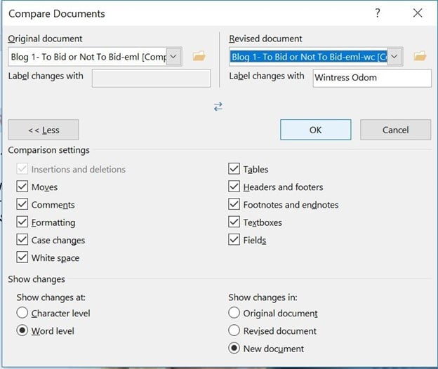 5. Click “OK.” Word will display a side-by-side comparison and a list of revisions.