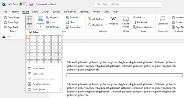 2. Click the “Insert” tab, then click on “Table.” The “Insert Table” menu will appear.