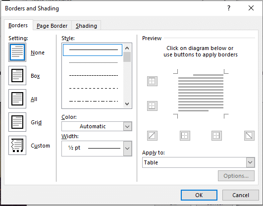 3. In the dialogue box that appears, choose the “Borders and Shading” button.