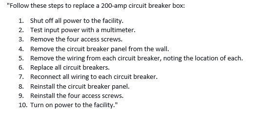 Notice that there are no adjectives and minimal descriptive language in this list of instructions. Also, while fiction readers will find this style boring and redundant, the electrician will appreciate not having to slog through large paragraphs to find the information they need.