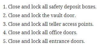 Instead, try using like-type instructions. Here is an example of a bank manager closing their doors at night: