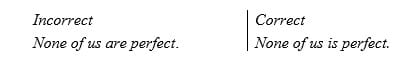 The idea of the word “none” being followed by a singular verb has been indelibly etched in my brain. In Rule 9, “The number of the subject determines the number of the verb,” I sailed right through using a singular verb after each, either, everyone, everybody, neither, nobody, and someone. I continued to congratulate myself in knowing: